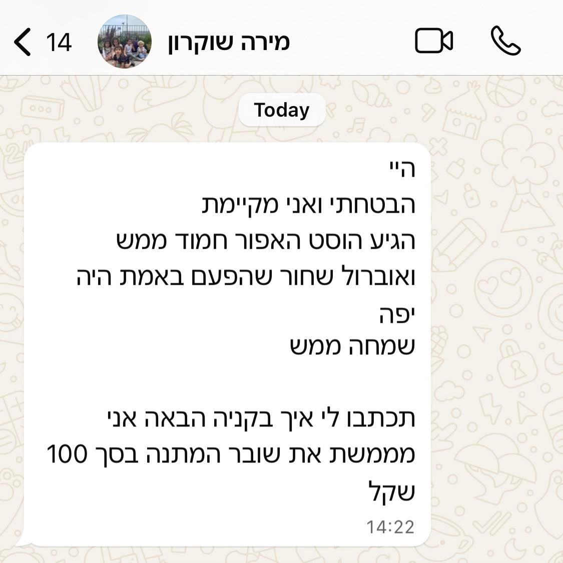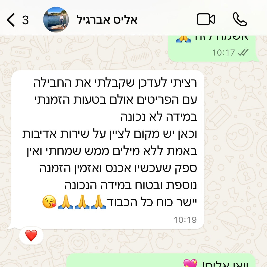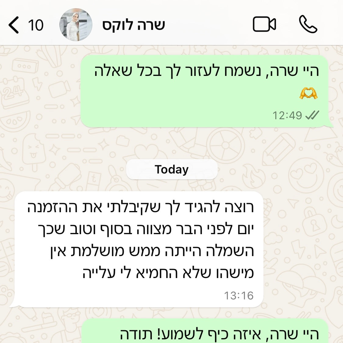 * ייתכנו עיכובים בזמני האספקה במקרים חריגים, כגון עומסים, חגים, הגבלות קורונה או אירועים ביטחוניים.